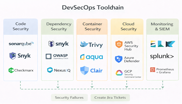 SonarQube, Snyk, Trivy, OWASP ZAP, Checkov, ELK Stack, and cloud-native security tools.